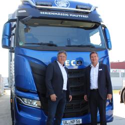 Das Fahrzeug, ein Volvo FH 500, wurde an Ronny Pflug und Horst Wagner überreicht.