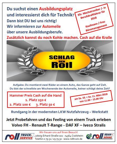 Roll Truck-Service ist ein modernes Nutzfahrzeug Centrum in Crailsheim am Autobahnkreuz A6/ A7. Der Mehrmarkenbetrieb mit den Nutzfahrzeug Marken Volvo, Renault, DAF, Iveco hat den Vorteil durch die nahe Anbindung zur Autobahn. Mit seinen 54 Mitarbeitern in 2 Schichten bieten die extra langen Servicezeiten von 6.00 Uhr bis 22.00 Uhr einen idealen Anlaufpunkt für den Nutzfahrzeug Service. Der Service wird durch eine Diesel Tankstelle und LKW Waschhalle ergänzt. Mit 5 Meistern ist dieser Fachbetrieb nicht nur für die Zugmaschinen ein Anlaufpunkt, sondern auch bei den gezogenen Einheiten ist der Service groß. Hierzu bestehen Partnerschaft Verträge mit den namhaften Herstellern der Trailer Branche. Ein 24h/7 Tage Notruf- für Pannen-, Berge- und Reifendienst erweitert das Serviceangebot , darüber hinaus ergänzen der Abschlepp-, Ölspur- und Verkehrsflächenreinigungsdienst das Portfolio. Roll Truck-Service ist seit Jahrzehnten ein Ausbildungsbetrieb, welcher in der Regel ständig 8 Azubis im Betrieb ausbildet. Auch die Weiterbildung der Mitarbeiter bei den Markenpartnern wird permanent gefördert.