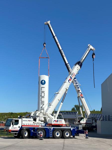 Aufrichten des LNG Silotankes mit zwei speziellen Mobilkränen der Roll Kran- und Arbeitsbühnen GmbH